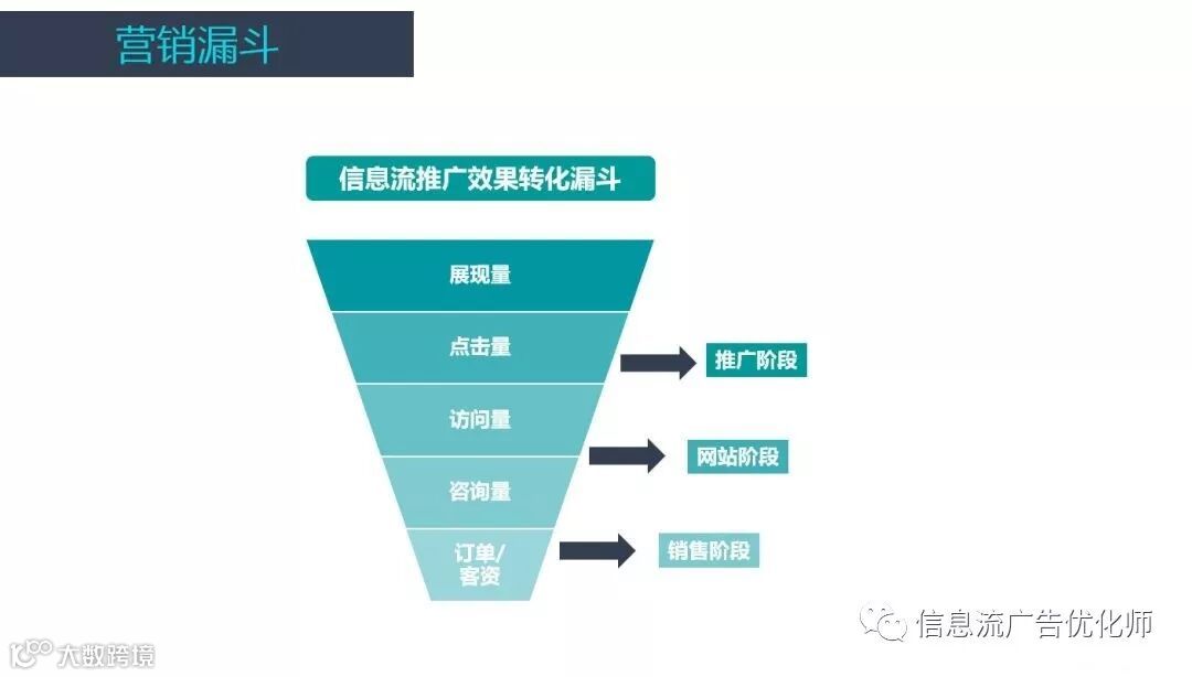 漏斗的五层对应了营销的各个环节,反映了从展现、点击、访问、咨询,直到生成订单过程中的客户数量及流失。 从最大的展现量到最小的订单量,这个一层层缩小的过程表示不断有客户因为各种原因离开,失去兴趣或放弃购买。