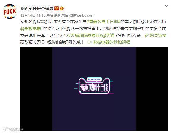 老板电器最近频频搞事情,除了承包《青春旅社》里面的厨房以外,借着综艺的大热以及年底品牌营销季,开启了一波以 " 青春饭局 " 为主题的品牌活动。