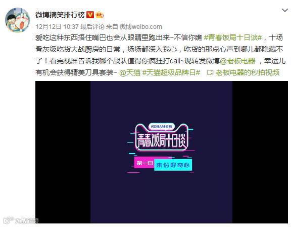 为了让消费者有更深刻的体验,老板电器和天猫一起举办了“青春饭局来不来”直播活动,年轻有态度,好玩又好吃,让话题更进一步地落地到实物。网友们看完纷纷表示:原来你是这样的老板电器!