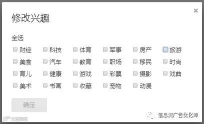 兴趣,看图说话,23个,做过兴趣流量测试,从大到小排依次为旅游、游戏、科技、房产、美食、汽车、动漫、时尚、军事、职场、财经……(仅供参考!)