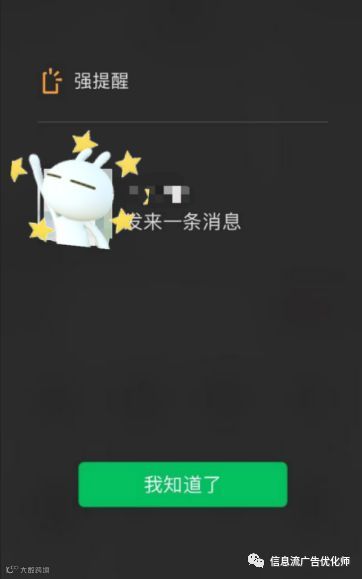 在新版本中『强提醒』功能真的有点强,霸道总裁范,只要给聊天的对方设置为『强提醒』对象,那么对方所发过来的信息,立马就会触发『强提醒』,整个屏幕都被占用,不点击『我知道了』,就甭想跟其他人聊天了。 升级版的『特别关注』―『强提醒』,更适合霸道的、有条件的小改改、小哥哥们。