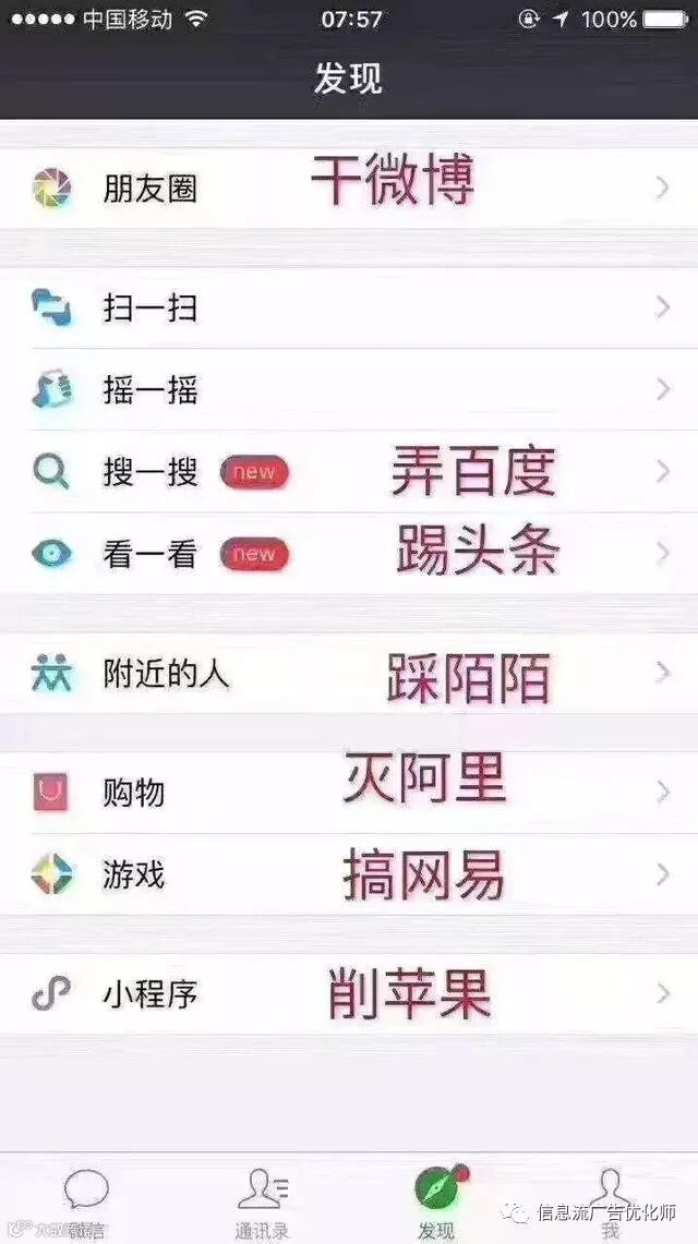 首先来了解一下微信在功能上全新在市场上的布局,增加了搜一搜与看一看,行业里的人一眼就能看出,这是对标目前行业内最火的信息流所衍化的新功能。