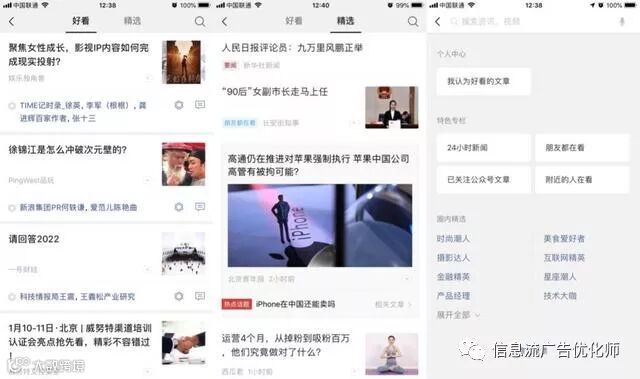 微信7.0之前,许多人并不知道“看一看”这个微信中心化信息流页面的存在。“看一看”和头条的中心化信息流的思路是一致的,通过算法将公众号、企鹅号的文章和内含的腾讯视频内容进行个性化推荐。
