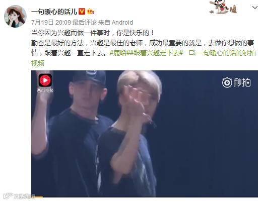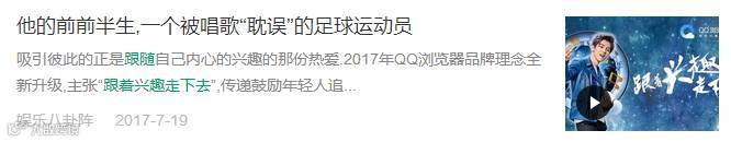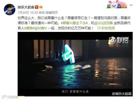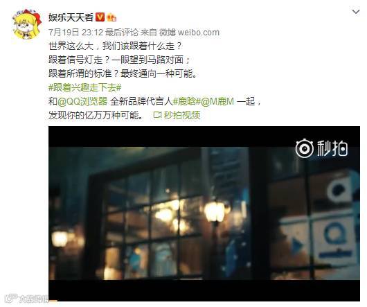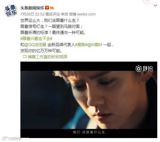 2017年七月,鹿晗成为QQ浏览器代言人后,一支由其拍摄的广告片也随之曝光,倡导主题:“跟着兴趣走下去”,引发网友热议。
