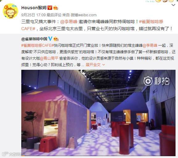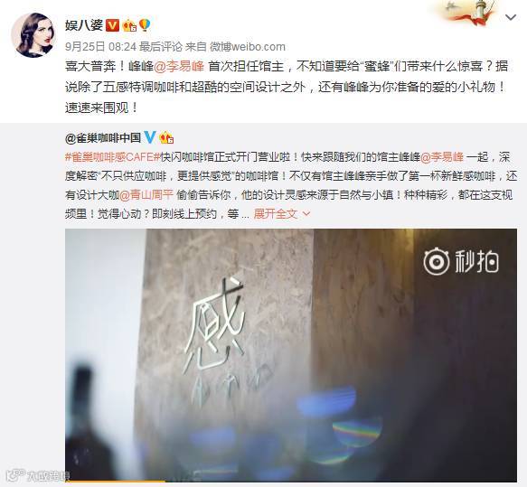 为“自家”的咖啡店开业宣传,代言人李易峰拍摄广告视频,邀请众网友,体验五感空间,特调咖啡等等,为粉丝们准备了众多周边、好玩的小物。