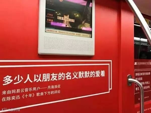 3月20日,网易云音乐发起了一个营销活动,名字是《看见音乐的力量》。这个活动迅速引爆了社交网络,网易云音乐把应用上的UGC评论被搬进了车厢和地铁站,每个踏进车厢的旅客很快就会看到这些字句,接着被这些文字戳中。在更广阔的社交媒体上,被戳中的人们开始了一轮又一轮的转发......
