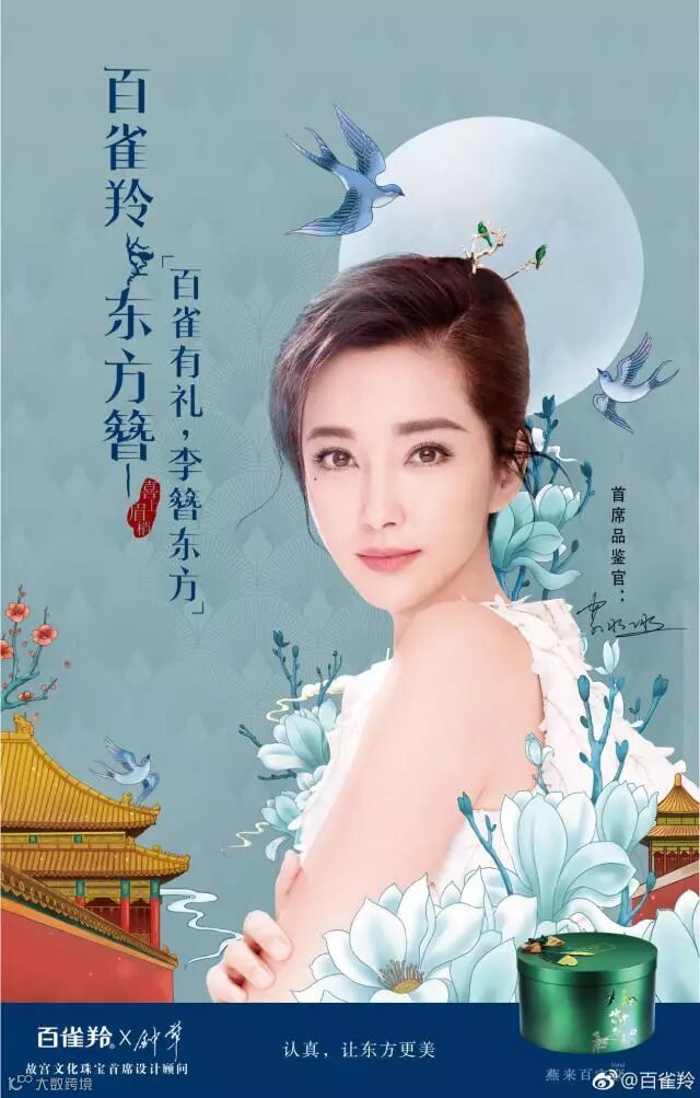 产品海报上,百雀羚首席品鉴官李冰冰佩戴东方簪,淡蓝色的背景和圆月、白玉兰、百灵鸟等具有民族特色的元素集合在一起,将东方美的韵味表现的淋漓尽致,彰显“认真,让东方更美”的主题。