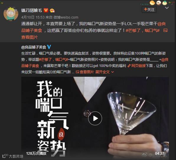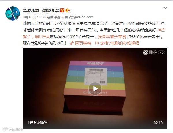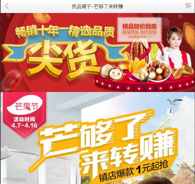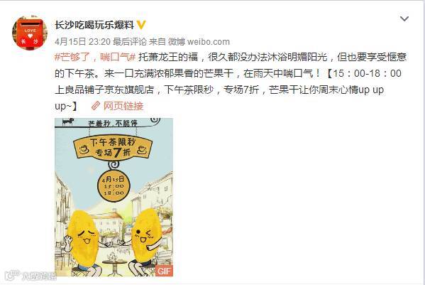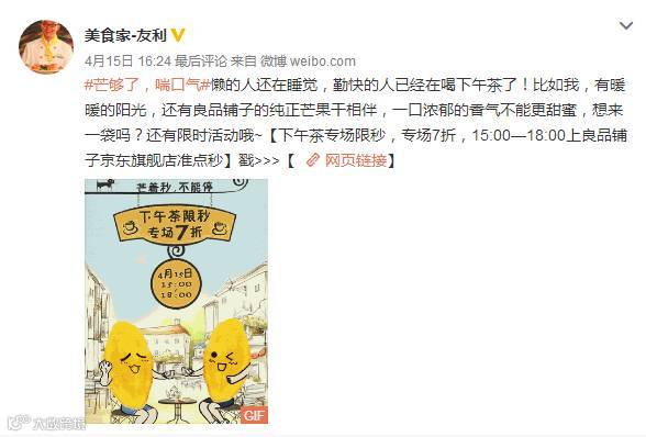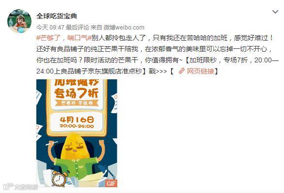 2017年四月,良品铺子携小花杨紫推出新品芒果干,并开展京东专场7折、参加话题、转发抽奖以及满减等活动,以#芒够了,喘口气#为主题开展系列营销。