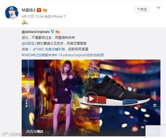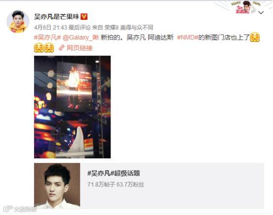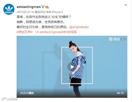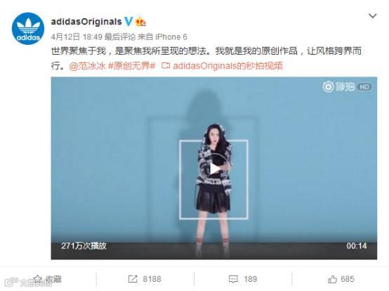 Adidas采用一贯的明星红人代言+微广告视频+活动的推广模式,吴亦凡、angelababy、范冰冰、孟佳等明星偶像纷纷为新品拍摄微视频。在明星效应的推动下,新品一经上市,迅速引爆潮人圈。