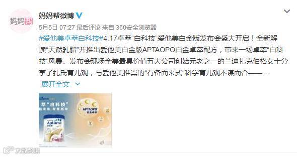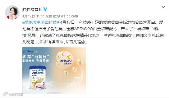 爱他美推出新品“爱他美白金版APTAOPO白金卓萃配方”,特邀兰迪扎克伯格女士参与发布会并全网直播,分享扎氏育儿秘籍,以#爱他美卓萃白科技#为话题,选取多位红人账号宣传推广,达到话题传播、新品宣传的效果。