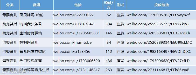 除了选取影响力较大的生活类kol外,考虑到产品的性质,选取母婴幼儿类账号进行微博推广,因此类kol的受众多为年轻妈妈,粉丝粘度更高能够直达消费群体。