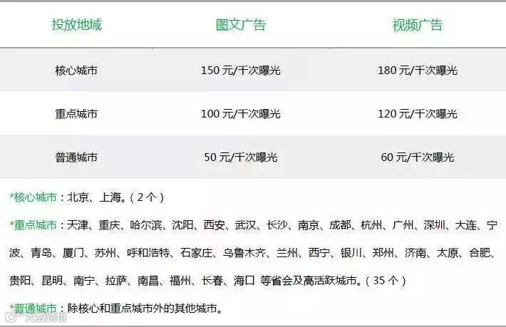 最新发布的朋友圈视频广告支持通过动态视频传达广告创意,表现手段更加丰富、直接、有效。(点击阅读原文可了解最新朋友圈广告产品形态介绍)视频广告收费标准为:核心城市180元/千次曝光,重点城市120元/千次曝光,普通城市60元/千次曝光。