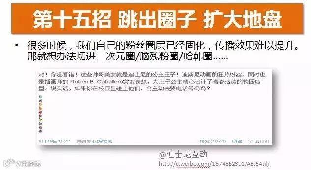 比如我们在迪士尼账号里,我们找了一些国外的素材,这些帅哥美女就是迪士尼的公主王子,这就相当于把迪士尼的经典人物进行二次元风格的重新设计,这个东西就戳中了粉丝,就纷纷转发,因为这个内容是属于他们的,他们爱看的,等于把原来的卡通、欢乐的迪士尼态度扩展到二次元的圈层,扩大了账号的影响力。
