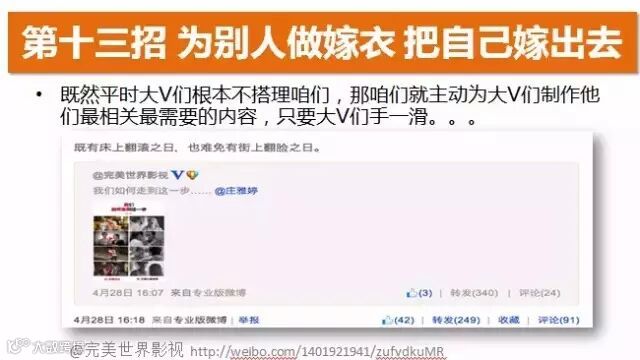 我们曾经在运营完美世界影视的官微,当时庄雅婷出一本新书《我们如何走到这一步》,我们就做了一个内容,就是用一系列的图片对比情侣是如何从热恋到分手这一步的,然后就@庄雅婷,就得到庄雅婷的转发。当时为完美影视公司带来了总计三百多条的转发。