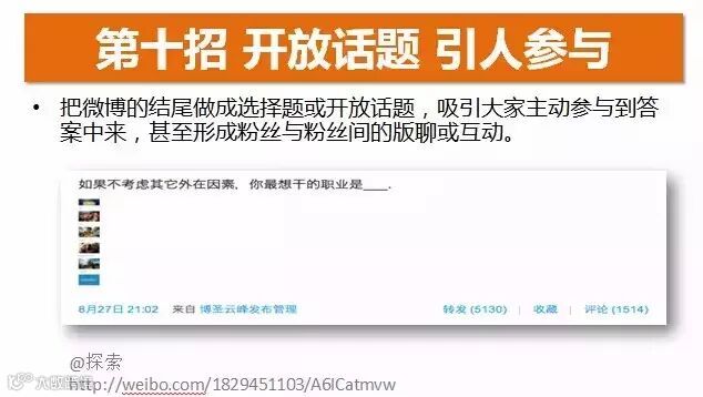 我们在微博做内容的时候,可以把微博的结尾做成选择题或开放话题,吸引大家主动参与到答案中来,甚至会形成粉丝与粉丝间的版聊或互动。