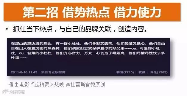 我们都讲借势,抓住当下热点,与自己的品牌关联,创造内容。这里的创造内容就是说我们的内容一定要是吸引人的内容,而不是自嗨。