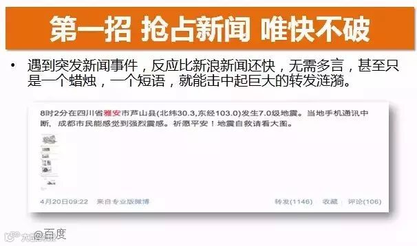 比如四川雅安地震的时候,如果这条微博是你最早发出来的,你的这条微博一定会被爆转。