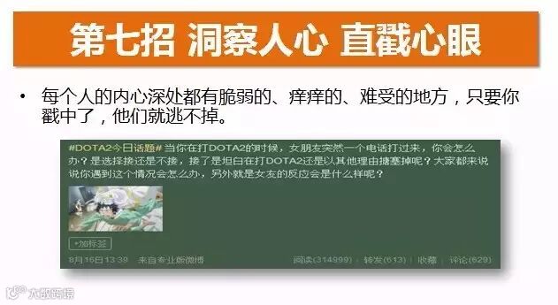比如你在打DOTA2的时候,女朋友打电话过来,你接还是不接?所以这种让粉丝感同身受的玩法,往往能得到网友的纷纷转发。