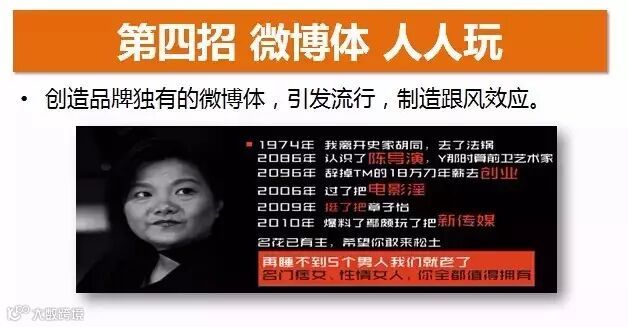我们可以通过一些手段去创造自己品牌的微博体,引发流行。比如笔者当年在做欧莱雅额时候创造出来一种“流年体”:每个名人都能把自己的年份编出故事来。其实大家都可以创造自己的微博体。