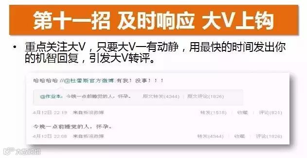 我们平时就应该重点关注大V,只要他们一有动静,用最快的时间发出机智的回复,只要能戳中大V,说不准大V一高兴,就能引发大V的转评。