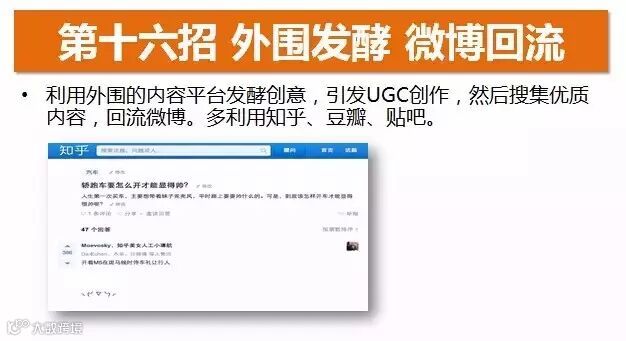 我们可以利用外围的内容平台,比如知乎、豆瓣、贴吧,第一我们通过这些地方对内容进行发酵,把这些内容炒火,然后再搬回到微博上;第二它可以变成你的内容源,你可以利用他产生一些内容,然后借鉴到你的内容创作上。
