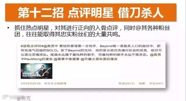 当时黄贯中在我是歌手的时候的打架事件引发了争议,那我们的官微就调出来支持黄贯中,说黄贯中自己多么热爱音乐,坚持beyond纯粹的精神,然后@黄贯中和他的粉丝团,可能是当时在打架,看到有人在挺他,然后就脑袋一热把这条微博转发出去,转发出去之后呢,又有人在他的微博下面攻击他,然后黄贯中在把自己的反击转发出去,这等于把我们的微博转发了两次,价值是10W块钱的转发,我们一块钱不花!