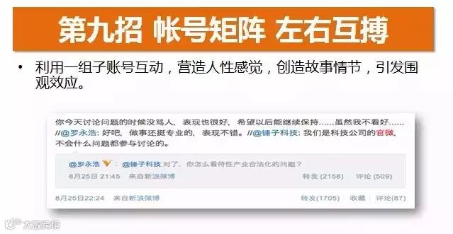 假设跟别的官微互动,别人不理你怎么办?没事,我们可以自己跟自己玩。我们利用一组子帐号互动,营造人性的感觉,创造故事情节,引发群众围观。比如著名的罗永浩的做法: