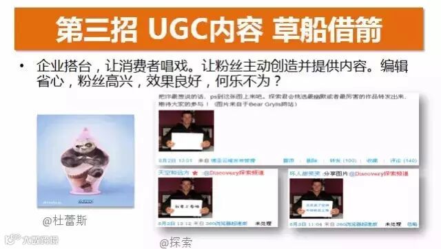UGC就是让用户自己创造内容,但我们如何调动粉丝的积极性,让他们为我们提供内容。比如左图的是一个粉丝做的:他是一个杜蕾斯的忠实粉丝,他就把TT套在功夫熊猫的身上,关键是我们的粉丝需要对品牌的狂热。