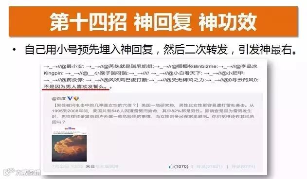 这是讲我们在发一些内容之后,我们可以预先准备一个小号。这个小号,在内容里面就埋了一个线索,是可以被人做神吐槽的,这个小号就是将这个神吐槽转发出来,然后推小号的神回复,进行二次转发,引发神最右。
