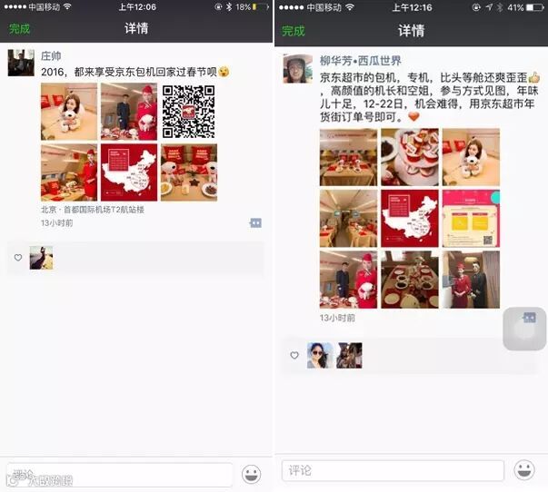 春运买票难是社会的公开痛点,每年都会上演春运大迁徙运动,回家一票难求,所以京东超市“包机免费送回家”的创意打的是亲情牌,借助电商圈内的鲁振旺、李瀛寰、王冠雄等意见领袖,在微博及微信端引爆话题讨论,在微信朋友圈里,将包机仪式的视频充分扩散、发酵,引发更多话题讨论。