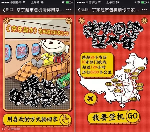 京东超市的春节大事件经过数天发酵后,终于到了刺激销售的关键期。1月18日,京东超市正式抛出了“京东超市包机请你回家过大年”的H5邀请函,整个H5描绘了传统春运回家过年的“彻夜排队买票”、“拥挤站立,年货淹没在人山人海”等痛点,用户点击“免费回家过年”和“我要登机”就可以参与活动。