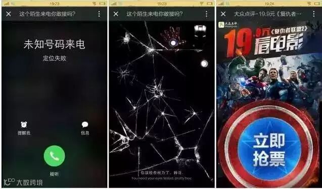 又是一个H5营销,大众点评为推广其19.9元看《复仇者联盟2》的活动推出了了一个名为“这个陌生来电你敢接吗”的H5,在视觉呈现上,设计方非常讨巧地躲开版权问题,只利用了各个英雄人物的武器来展现“复联2”的内容。