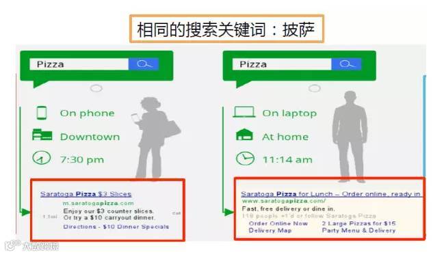 针对不同的时间、地点、场景,显示出同一广告主的不同广告内容。例如谷歌智能搜索的广告。你用手机搜索“披萨”是在市区晚上7点半,这时他告诉你的广告是:3美金一块外带晚餐只需要10美金。如果是中午11点你在家里PC端搜索“披萨”,他会告诉你,网上预定15分钟送到。