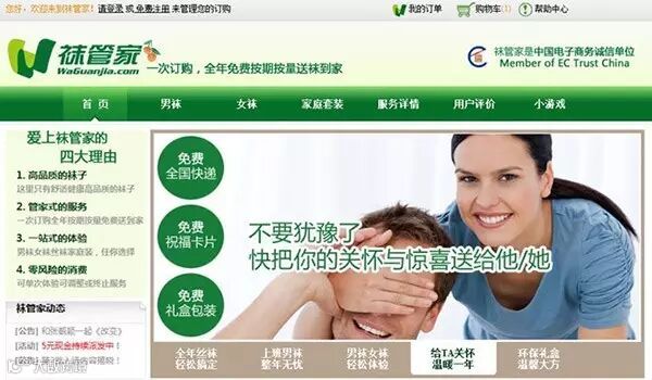 袜管家可以作为例子来看,该公司成立于2010年,刚开始主打包年或包月订购服务,按照约定的周期、为用户快递商品;而后推出“在线撒娇”功能,让女性用户邀请合适的对象为自己的购物车买单;后面又推出“袜子包年无限装服务”,类似于自助餐,用户可以一次购买、全年不限量地领取袜子……
