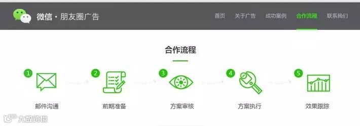 微信官方公布了合作流程,广告主只需通过官网自主申请,审核通过即可接入微信朋友圈广告,简单五步即可轻松获得亿级社交流量。