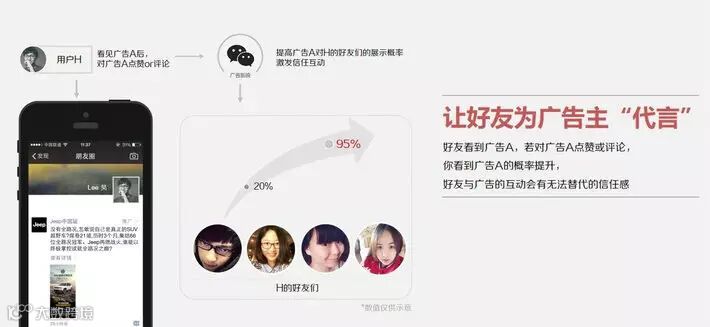 如果你与这条广告进行了互动(比如点击了详细信息、阅读了图片或者跳转链接,甚至点赞和评论),那么这条广告在你好友的朋友圈中出现的几率就提高到了95%。