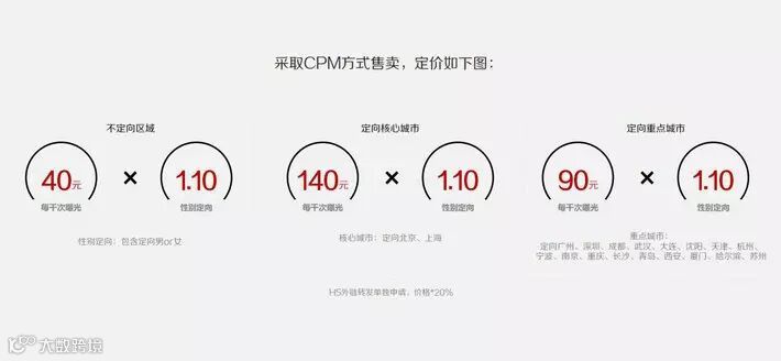 试运营一段过后,从300万广告门槛,以及大品牌才会合作,到昨天正式全面开放,开始接收中小企业投放广告,可以限定投放区域、性别等类别。