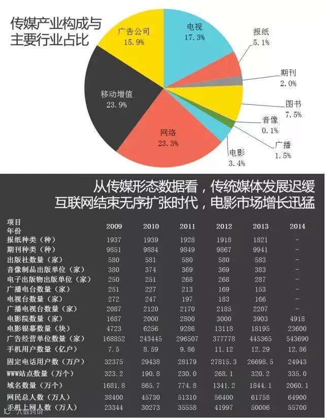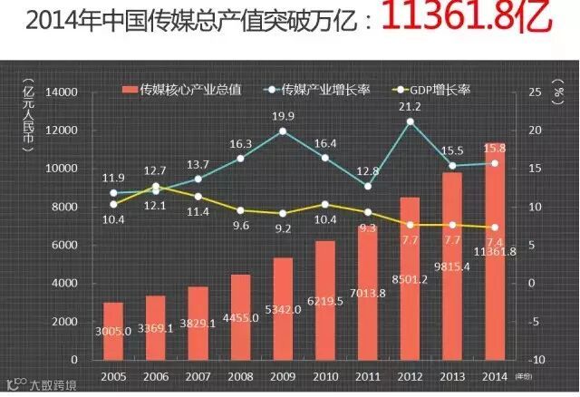 《传媒蓝皮书2015》发布,报告指出,2014年中国传媒产业总值首次超过万亿元(11361.8亿元),比上年同比增长了15.8%。这一年既是中国传媒产业走向媒介融合的关键时点,也是传统媒体与网络媒体霸主地位交替的重要节点。