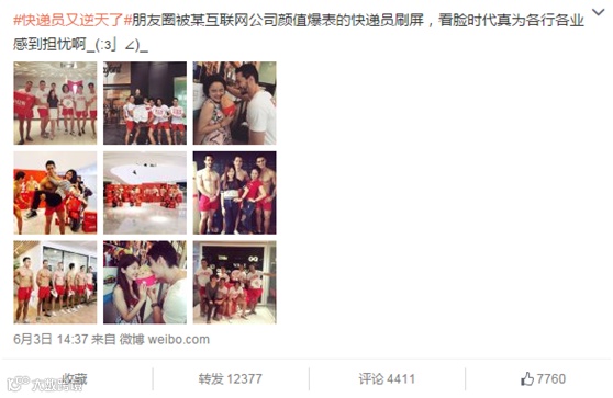 诸如6月6日周年庆利用小鲜肉的吸引力,肌肉男上门送货的照片刷屏朋友圈。这种营销方式让消费者参与到传播进程中,洞察女生的本能关注点,通过社交平台的扩散、将事件在网络环境中发酵,产生更加广泛的关注和话题,引发用户资源充当传播者,最广泛的向外部散布消息。