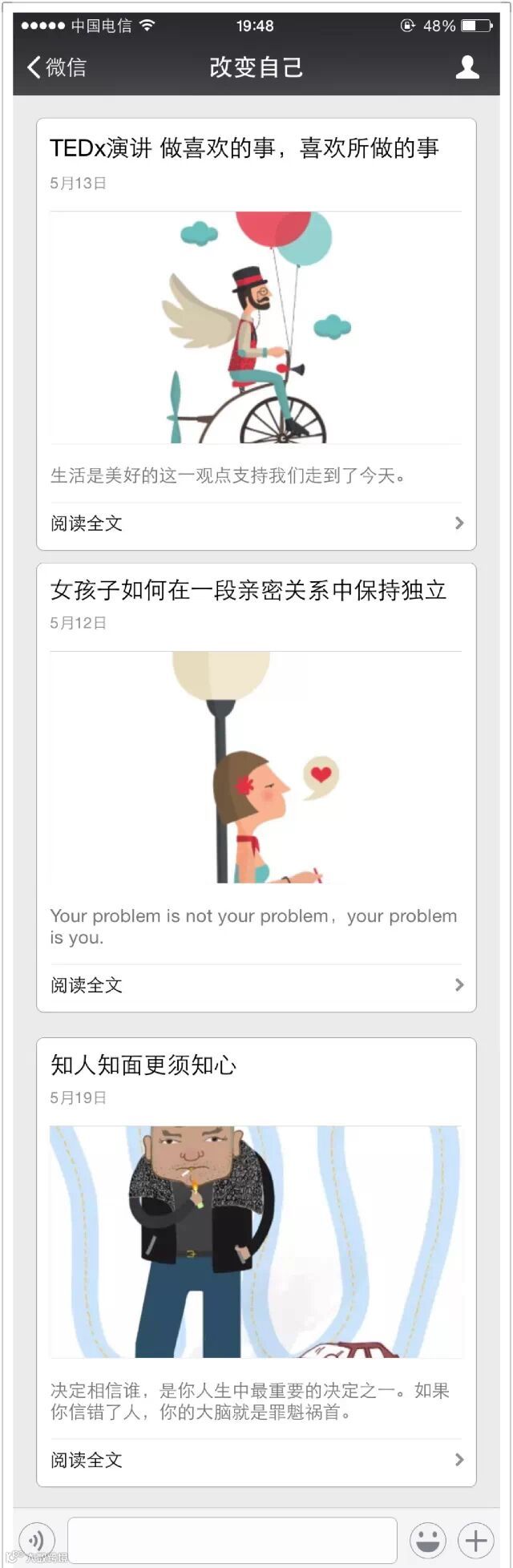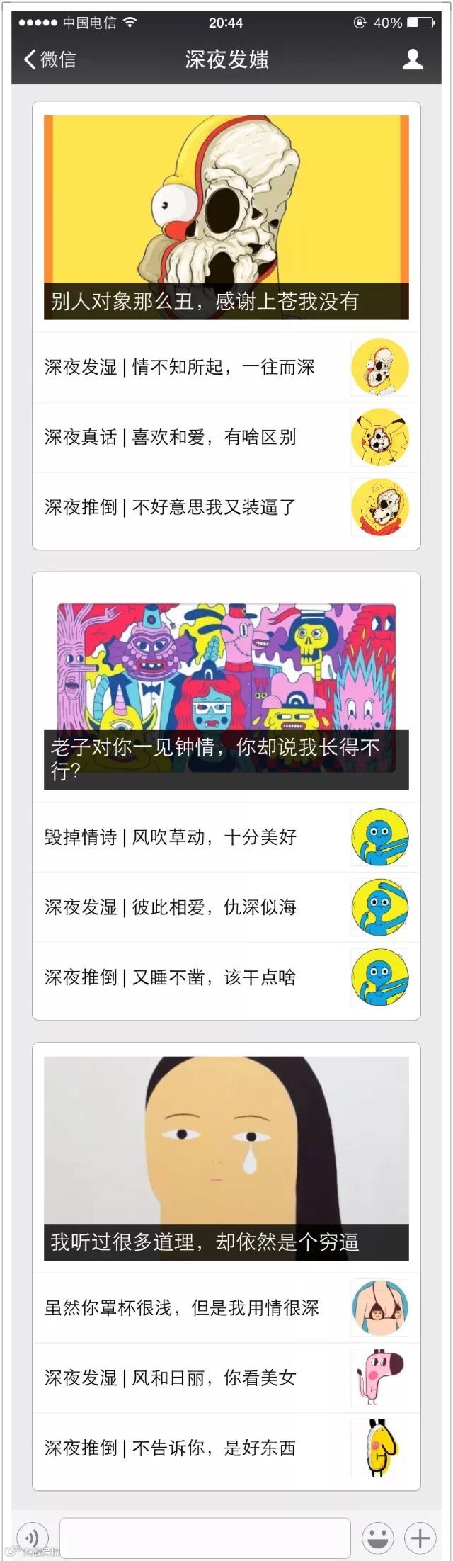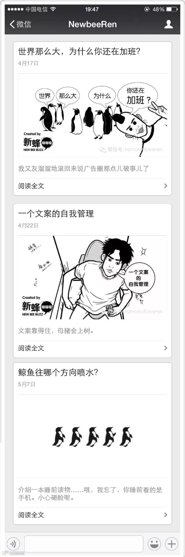 这个账号有意思了,它是一个会画漫画的广告文案做的,原创比例大、漫画偏逗比,而且,它的封面大多是作者画出来的,就像是这样……
