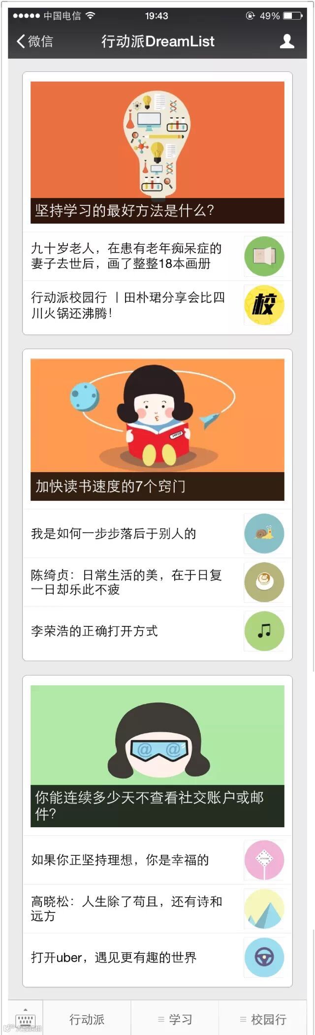 同为积极向上的微信账号,「改变自己」的风格和「行动派DreamList」完全不同。
