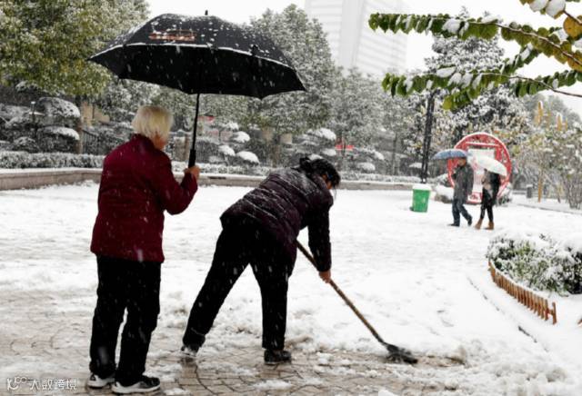一位工作人员在扫雪,而她85岁的母亲,就在旁边替她打着伞。