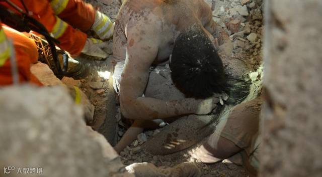 废墟里,营救人员发现一名遇难男子。在他半弯的怀抱里,一个小女孩被保护在里面,仍然活着。