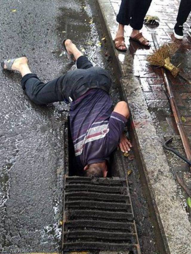 一位环卫工人趴在湿冷的路面,整个头都伸进漆黑的下水道里,进行清淤。
