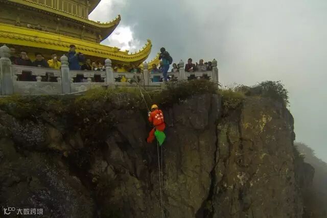 四川峨眉山景区断崖边,护栏之外,一名清洁工在垂直近90度的峭壁上捡垃圾。