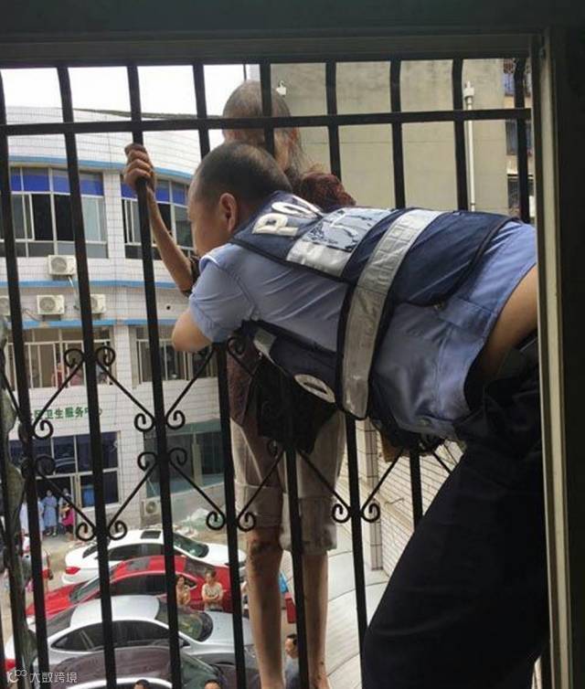 巡警队员王小科站在锈蚀严重的防护栏上,隔着栅栏抱住了老人。护栏很矮,他只能吃力地弯腰,几分钟之后,双腿开始发抖。