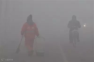 一位环卫工人仍然出现在大街上,身上鲜亮的橙色几乎看不出来。霾很重,他们那么少的收入,是否舍得给自己买一个防霾口罩呢?来往的车辆,会不会意外剐蹭到他们呢?他们的身体还好吗?