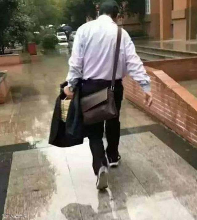 一位老师把自己的西装脱下来,盖在了学生的作业本上,自己只穿一件衬衫,在雨中淋着。