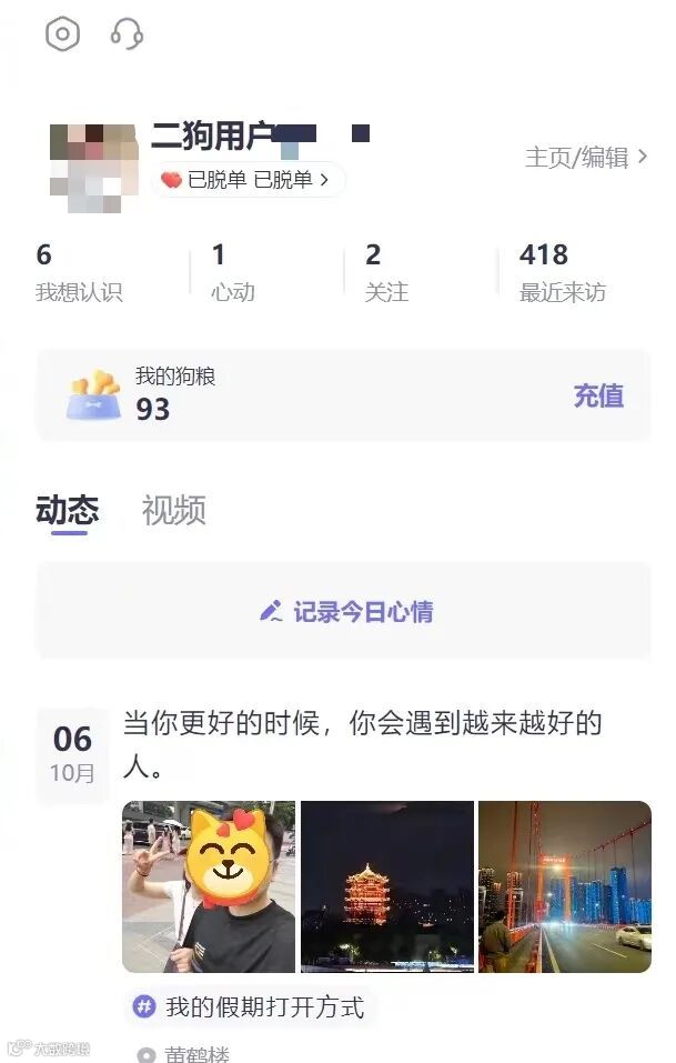 同事推荐我用的二狗,说上面的女生都很优秀,是个可以脱单的平台,所以我就过来脱单了~