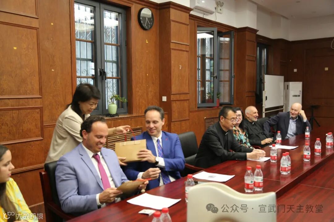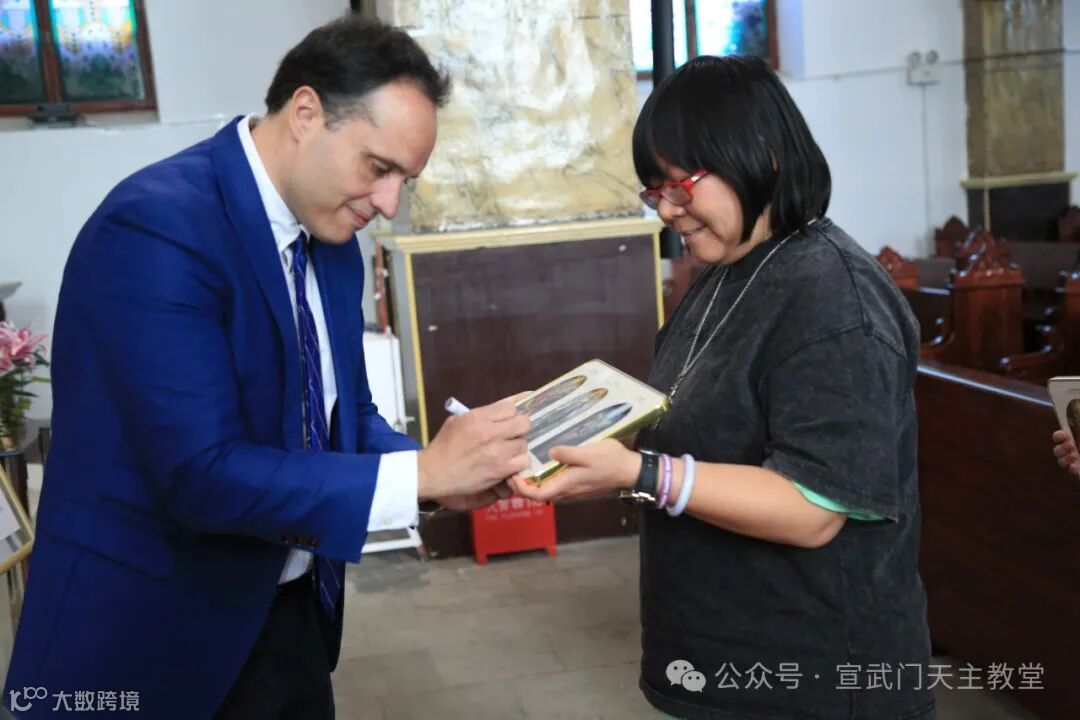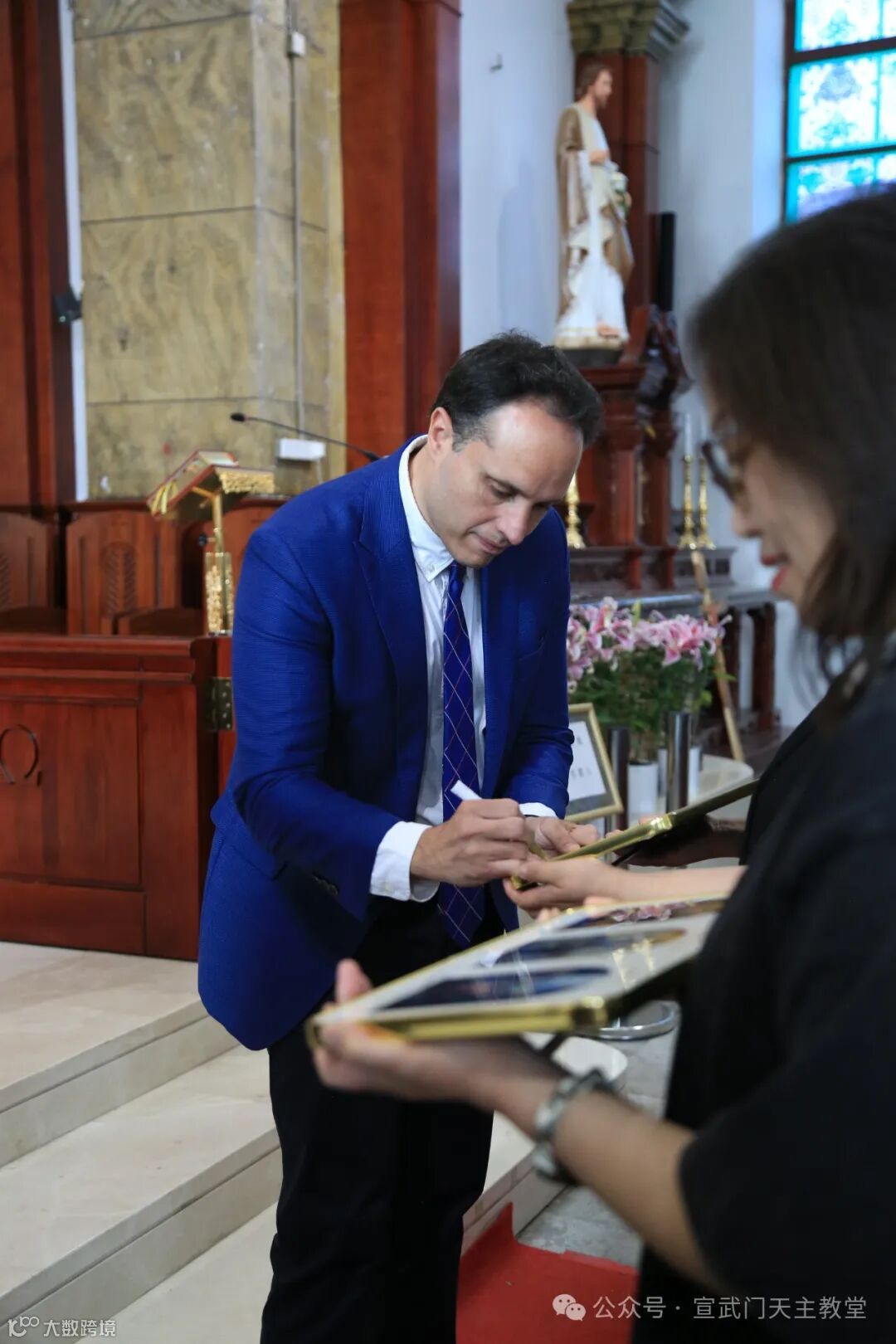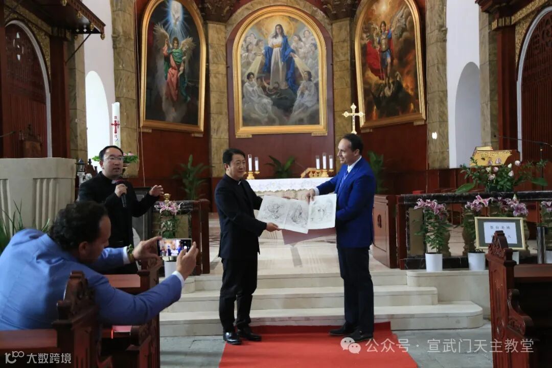 本堂张神父代表堂区堂区为劳尔送了堂区文创礼包(三联圣像画框、天使挂件、建堂420周年帆布包),表达堂区的谢意。画家劳尔也给堂区回赠了圣像的初稿。